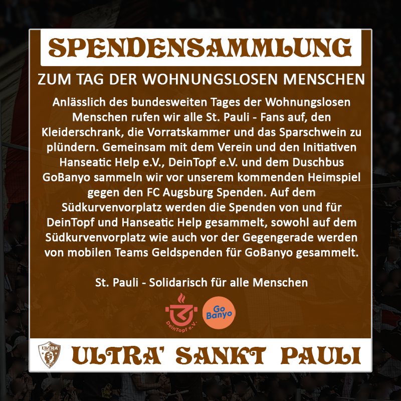 USP rief gemeinsam mit Hanseatic Help e.V. und DeinTopf e.V. auf den Südkurvenvorplatz zu Sachspenden und im Stadionumfeld zu Geldspenden für den Duschbus GoBanjo auf. GoBanjo, eine Initiative, die die Fanszene von St.Pauli bereits seit Jahren unterstützt, sind Spenden weggebrochen, die es aufzufangen gilt. Mit der Spendensammlung möchte die Fanszene eben jene Spendenlücke etwas verkleinern.