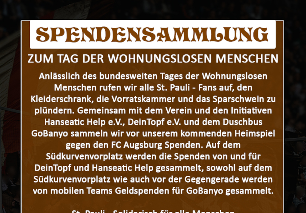 Das Motto des diesjährigen Aktionstages war „Politik in die Pflicht nehmen – Wohnungsnot beenden“. In Deutschland sind über 600.000 Menschen wohnungslos. Besonders in Ballungszentren wird es immer schwieriger bezahlbaren Wohnraum zu finden. Hinzukommt, dass der soziale Wohnungsbau rückläufig ist. Neu geschaffener Wohnraum ist entweder zu teuer oder die sogenannte Sozialbindung von Sozialwohnungen läuft aus. Somit verschärft sich die Wohnungsnot immer mehr. Ein haltloser Zustand, da dieses strukturelle Problem viel zu zaghaft bis zumindest spürbar nicht von den politischen Handlungsträgern angegangen wird. Um den Alltag von wohnungslosen Menschen etwas würdiger zu machen, rief Ultrà Stankt Pauli zu Spenden auf.