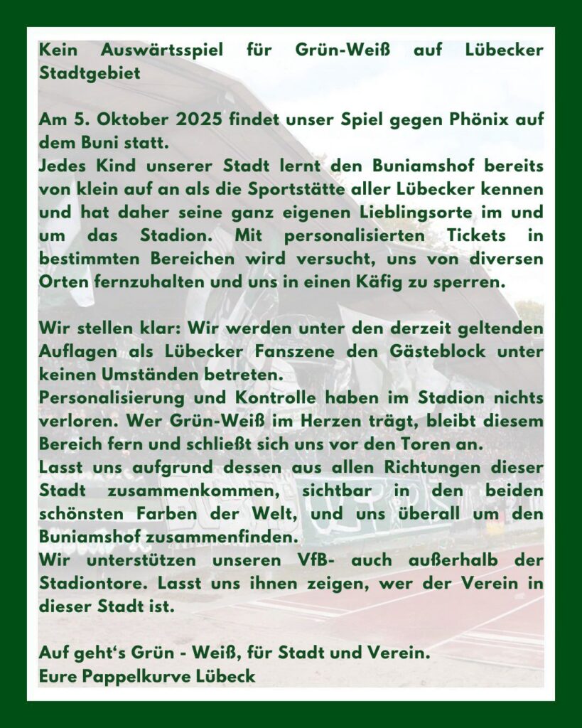 Am 05. Oktober kommt es im Rahmen des 13. Spieltages der Regionalliga Nord zu einem Stadtduell in Lübeck, wenn der VfB beim 1. FC Phönix gastiert. Obwohl zwischen beiden Vereinen keine besondere Rivalität besteht und viele VfB’ler das Stadion von klein auf kennen, wird dieses Aufeinandertreffen nun von den Verantwortlichen mit strengen Auflagen versehen, was die aktive Fanszene zu einer Boykottandrohung veranlasst.
