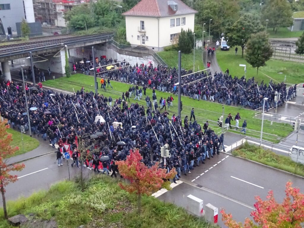 Für den Spieltag mobilisierte die Muttenzerkurve für einen Treffpunkt am Münsterplatz, wo man sich ab 14:00 traf und es um 18:00 per Fußmarsch auf den über einstündigen Weg zum Mooswaldstadion ging. Bis Freiburg reisten die Fans auf unterschiedlichen Wegen an. Die Gruppen der Muttenzerkurve wählten den Zug als Anreisemittel und erreichten zur Mittagszeit die Stadt im Breisgau.