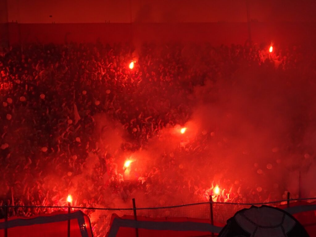 Die Heimseite zeigte eine Choreo unter dem Motto „Attacke“ – eine Anlehnung an einen alten Schlachtruf („Attacke, hier kommt der SCF“) aus den 1990er Jahren, der mit einem Pfeifen eingeleitet wird. Hinter dem hochgezogenen Spruchband erblickte man weiße Luftballons, Wurfrollen und rote Bengalen.