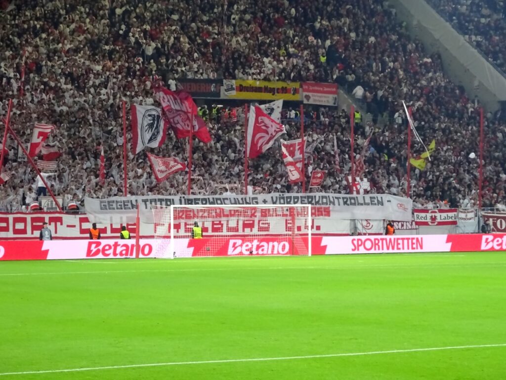 Dem gegenüber stand die gigantische Stehplatztribüne der Freiburger. Seit 2021 ist das Mooswaldstadion die neue Heimat des SCF. Trotz nicht optimaler Gegebenheiten entwickelt sich die Freiburger Szene hier Stück für Stück weiter. Vor allem ab dem zweiten Tor der Gastgeber erreichte die Heimkurve oftmals eine ordentliche Lautstärke und das auch nicht nur bei einfachen Schlachtrufen. Bengalen untermalten nahezu das ganze Spiel über die Gesänge der Freiburger.