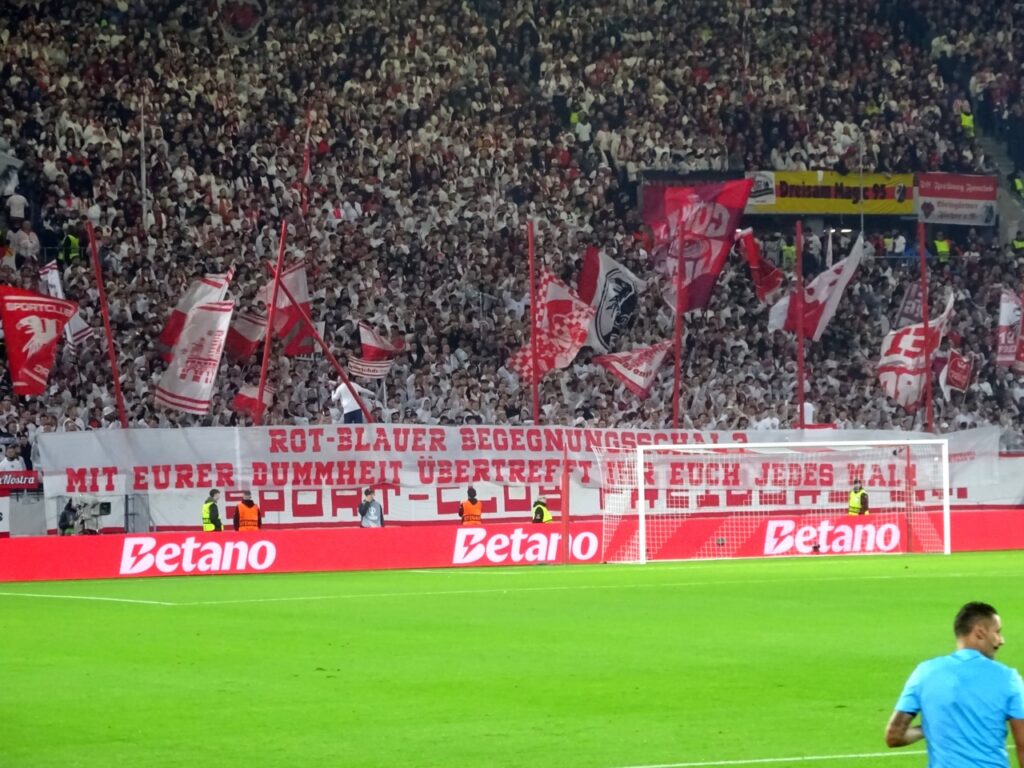 Einige Minuten waren weitergespielt, da zeigten die Gästefans das nächste provokante Spruchband: „Dangge für d Gaschtfründschaft – d Mieti liggt im blaue Tresor“. Eine Anspielung auf einen Tresor des Freiburger Fanprojekts, mit der man weitere Verwirrung stiften wollte.