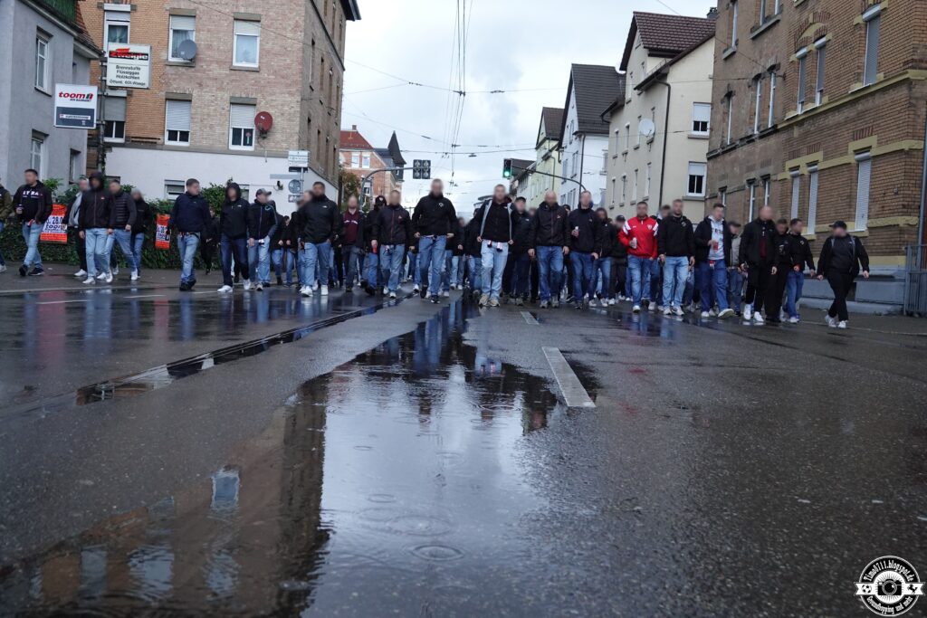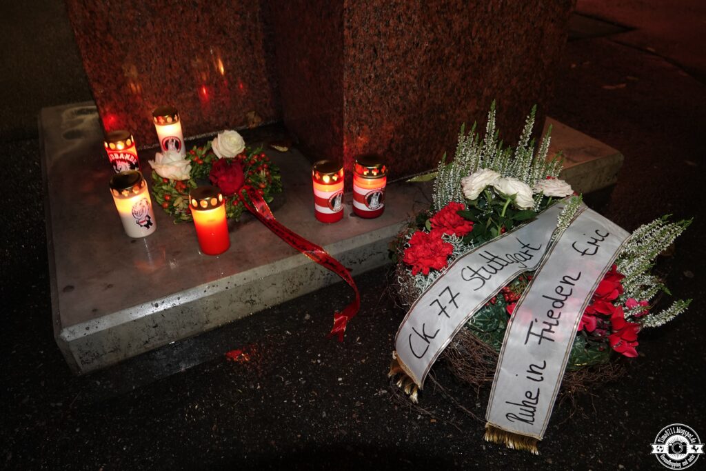 Am Stadion angekommen, versammelte sich die Szene an der Gedenkecke und nahm mittels Trauerrede, Kranz sowie Gedenkkerzen Abschied von zwei kürzlich verstorbenen Wegbegleitern: Einerseits von Eric, Mitglied des ältesten noch existierenden VfB-Fanclubs CK77. Für ihn zeigte man später im Stadion ein Spruchband. An der CC97-Fahne sowie beim CK77 hing zudem ein Trauerflor. Außerdem musste man Abschied von Steffen nehmen, einem langjährig in der Kurve aktiven Ordner. Auch für ihn zeigten die Fans ein Trauerspruchband.