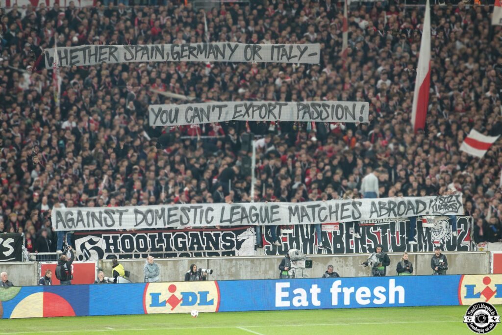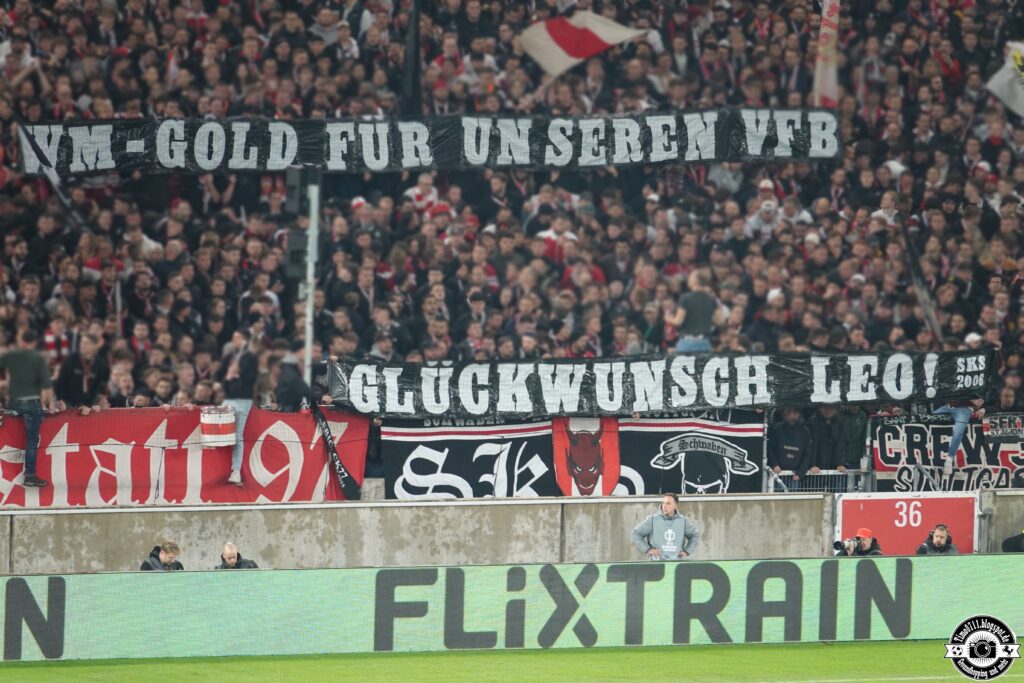 Spruchbänder gab es heute in der Heimkurve gleich mehrere zu unterschiedlichen Themen. Neben den beiden Trauerspruchbändern der gesamten Kurve gratulierte SKS Leo Neugebauer, der vergangenen Sonntag in Tokio bei der WM im Zehnkampf für den VfB antrat und WM-Gold nach Stuttgart holte. Außerdem kritisierte man die in manch Spitzenliga durchgeführten oder angedachten Verlegungen ins Ausland mit Spruchbändern. Faszination Fankurve berichtete über den breit aufgestellten Protest hunderter Gruppen aus ganz Europa.