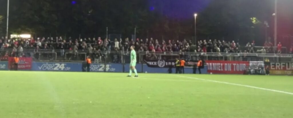 Auf dem Hinweg zum Spiel in Berlin stoppte die Polizei den Tross der Erfurter Fanszene und kontrollierte diese. Die Schikane zogen sich letztendlich so lange hin, dass die Fans das Auswärtsspiel ihres Vereins verpassten. Somit fand im Stadion keine organisierte Stimmung statt.