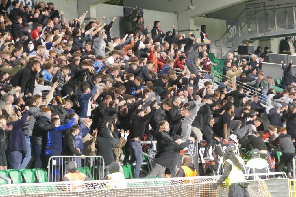 Der Support der Gästefans lässt sich als „klassisch spielbezogen“ beschreiben. Gelegentlich wurde eine Trommel eingesetzt, ansonsten gab es auch hier viele Ruhephasen. Auffällig war, dass es im gesamten Stadion weder Fangnetze noch Zäune gibt – Zustände, wie man sie bei einem Derby nur selten sieht. Vor dem Gästeblock stellten sich deshalb mehrere Ordner auf und hielten ein Plastiknetz hoch, um die Fans zurückzuhalten. Beim Torjubel funktionierte das jedoch nicht wirklich, sodass viele Gästefans auf der kleinen Mauer direkt am Spielfeldrand standen.