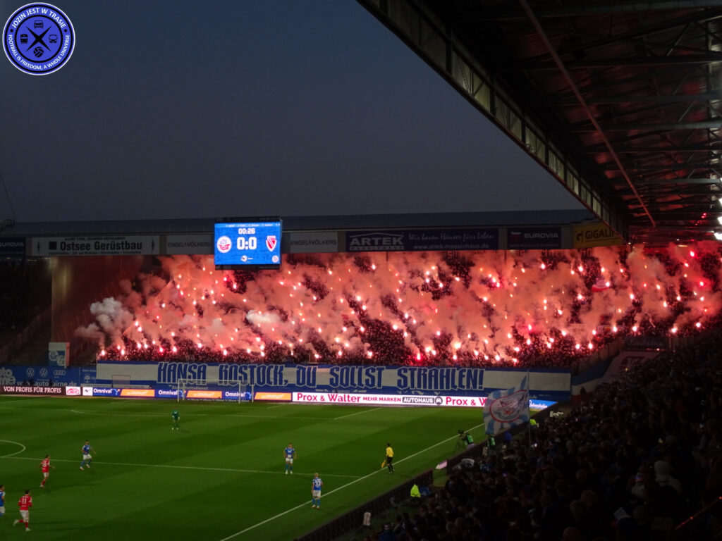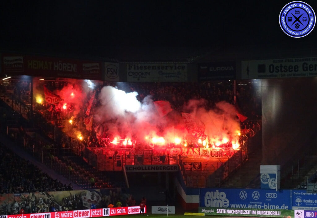 „Hansa Rostock, du sollst strahlen!“ – eine Textzeile aus einem bekannten Rostocker Fangesang, die am Dienstagabend gegen Energie Cottbus auch als Spruchband zur großen Pyroshow auf der Südtribüne diente. Auch die Gästefans hatten einiges an Pyro im Gepäck und zeigten im Laufe des Spiels eine größere Aktion.