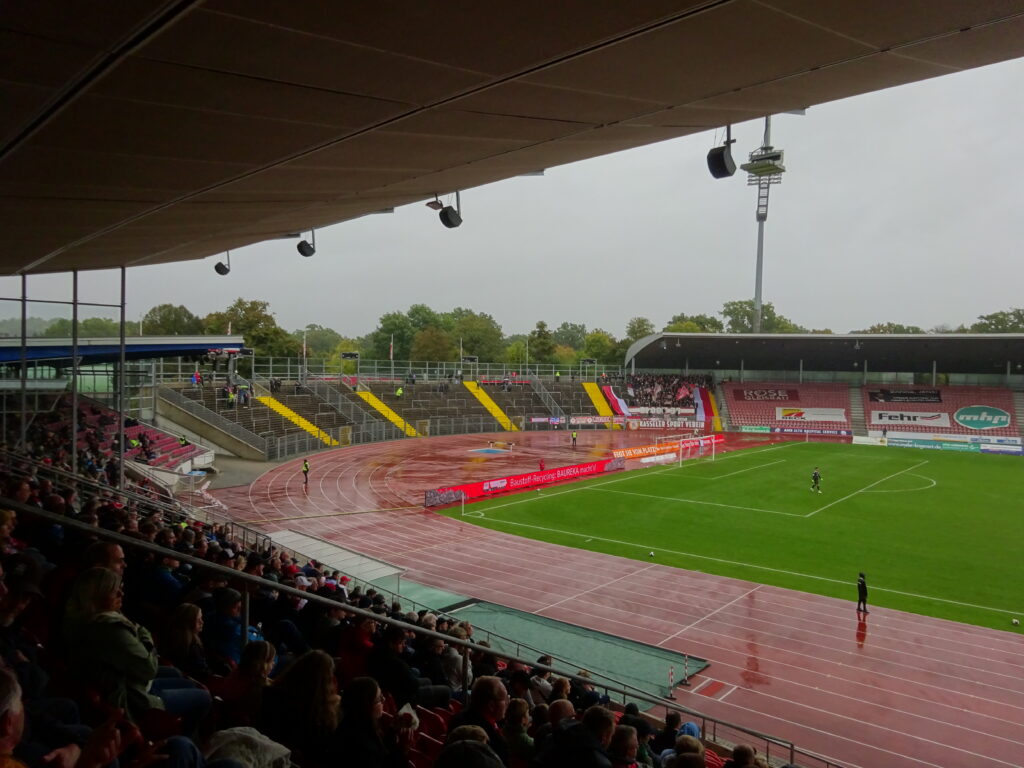 Einst waren bis zu 37.000 Zuschauer im Auestadion in Kassel anwesend. Heute sind nur noch etwa die Hälfte offiziell zugelassen, was jedoch schon lange nicht mehr ausgereizt wurde. Auch in Liga 4 verfügt der Verein weiterhin über eine treue Anhängerschaft. Zum heutigen Heimspiel versammelte sich erneut eine vierstellige Anzahl an KSV-Fans – trotz Dauerregen, eines Platzes im unteren Tabellenmittelfeld und eines aus Fansicht unattraktiven Gegners. Auf dem Rasen gab es gegen Walldorf allerdings eine schmerzhafte 1:3-Niederlage.