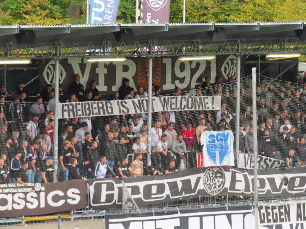 Die Heimseite zeigte während des Spiels zwei Spruchbänder. Zum einen wurde kritisiert das Fans während der Wasen in Tracht zu Aalen-Spielen gehen. Zum anderen sprach man sich klar dagegen aus, dass der aktuelle Regionalliga-Tabellenführer aus Freiberg bei einem Aufstieg seine Spiele in Aalen austrägt. Dazu wurde auch ein Logo des SGV Freiberg im Fadenkreuz hochgehalten. Die Fanszene des VfR Aalen, die Unterstützung ihrer Freunde aus Landshut erhielt, überzeugte mit einem geschlossenen und lautstarken Auftritt und konnte auch mit Unterstützung des Dachs über das gesamte Spiel das Duell auf den Rängen ausgeglichen gestalten.