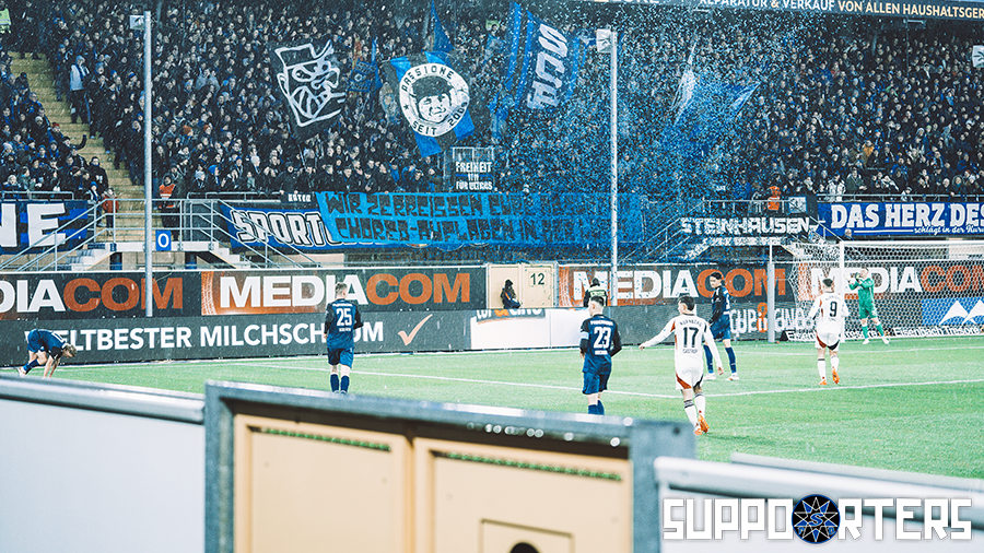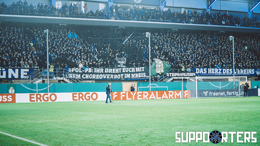 Wie eingeschränkte Aktionen aussehen können, zeigte die Paderborner Fanszene bereits in der vergangenen Saison 2024/2025 – so zum Beispiel beim Pokalspiel gegen Bremen, wo unter dem Motto „DPOL-PB: Ihr dreht euch mit eurem Choreoverbot im Kreis … unsere Jungs heizen wir trotzdem ein.“ im Bereich des Stimmungsblocks blaue und schwarze Tafeln hochgehalten wurden.
