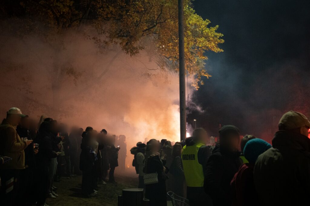 Zum Einlaufen der Mannschaften zündeten die Heimfans über die komplette Gegengerade und Hintertortribüne rote Fackeln und zwei Batterien.