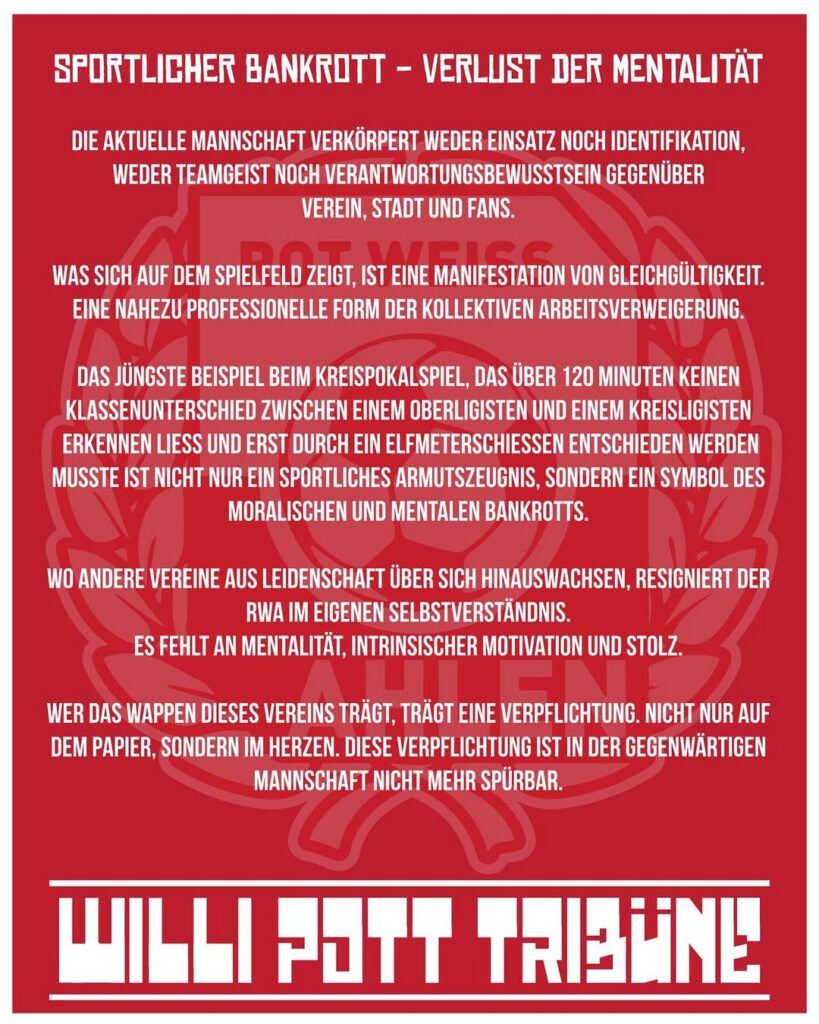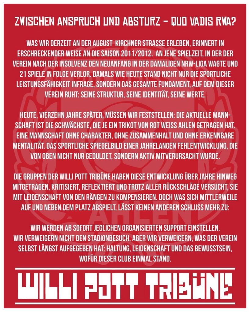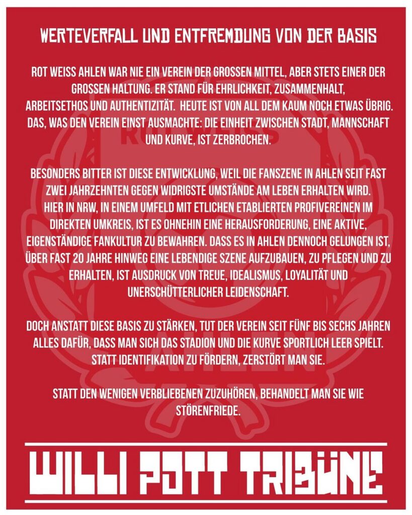 Schon bei der 4:0 Pleite gegen den ASC 09 Dortmund am 24. August packte die Fanszene von Rot-Weiß-Ahlen frühzeitig ein und verließ das Stadion. Jetzt hat die „Willi Pott Tribüne“ ein Statement veröffentlicht, in dem sie ankündigt, bis auf Weiteres den Support der eigenen Mannschaft ruhen zu lassen.