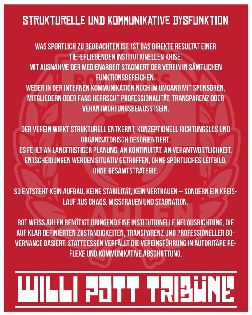 Sportlich läuft es alles andere als gut beim einstigen Zweitligisten Rot-Weiß-Ahlen. Nach 12 spielen steht der Verein mit nur 8 Punkten auf einem Abstiegsplatz. Nun hat sich die Fanszene zur Krise geäußert und Forderungen sowie Konsequenzen kommuniziert.