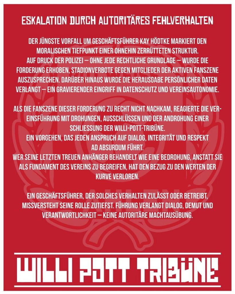 Faszination Fankurve dokumentiert die Stellungnahme der Willi Pott Tribüne:
