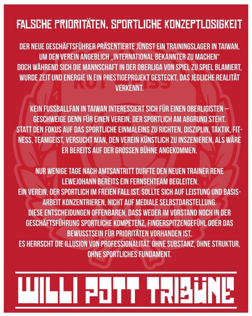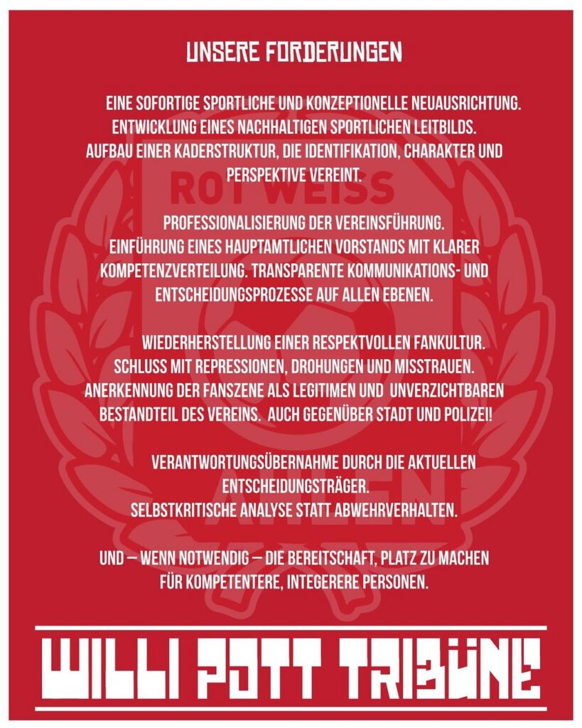 Aufgrund dieser und weiterer Punkte, hat die Willi Pott Tribüne Forderungen veröffentlicht, um die aktuelle Situation im Verein zu ändern. Dazu gehören unter anderem eine Neuausrichtung im Verein sowie die Professionalisierung der Vereinsführung. Auch die Wiederherstellung einer respektvollen Fankultur sieht die Fanszene als zentralen Forderungspunkt.