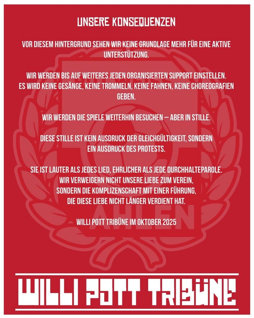 Die Fanszene, welche seit längerer Zeit gemeinsam wieder in einem Block, der Willi Pott Tribüne und steht, kündigt jedoch an, die Spiele weiterhin zu besuchen – bis auf Weiteres aber in Stille.