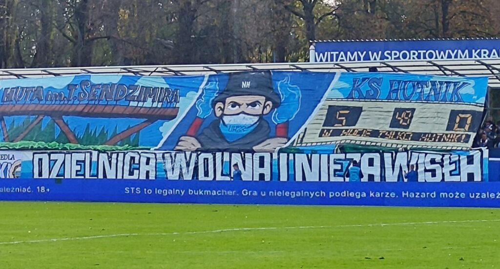 „Nowa Huta Nowa Huta HKS“ ist ein bekannter Schlachtruf der Anhängerschaft von Hutnik Krakau, der ausdrücken soll, dass im riesigen Krakauer Stadtteil Nowa Huta ganz allein Hutnik regiert. Denn dort ist der Verein mit seinem Stadion Suche Stawy beheimatet. Obwohl man über eine wesentlich kleinere Fanszene als die beiden Big Player der Stadt, Wisla und Cracovia, verfügt und dazu auch deutlich schlechteren Fußball bietet, kann man deren Sektionen in Nowa Huta die Stirn bieten und ist für viele Einwohner Nowa Hutas der einzig wahre Verein. Nun kam es im Rahmen des Puchar Polskis zu einem seltenen Duell zwischen Hutnik und Wisla, das trotz geschlossenem Gästeblock allerhand Brisanz bot.