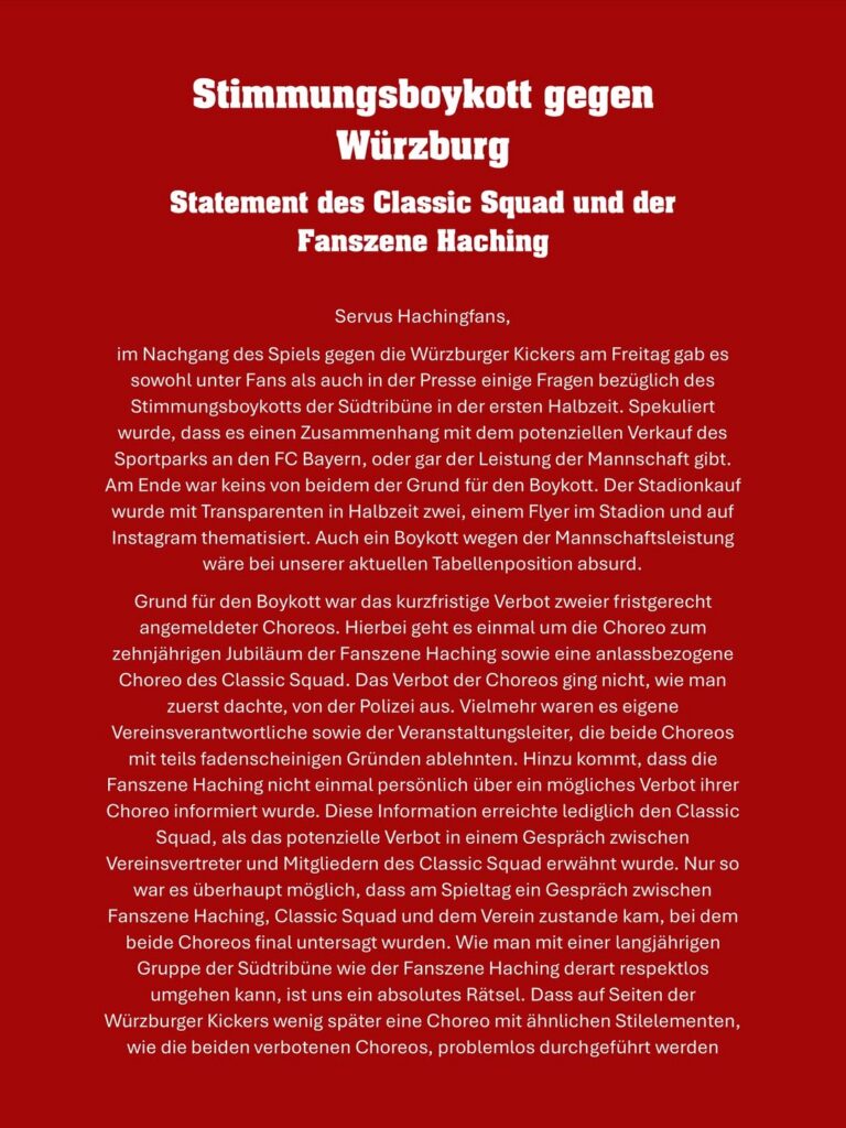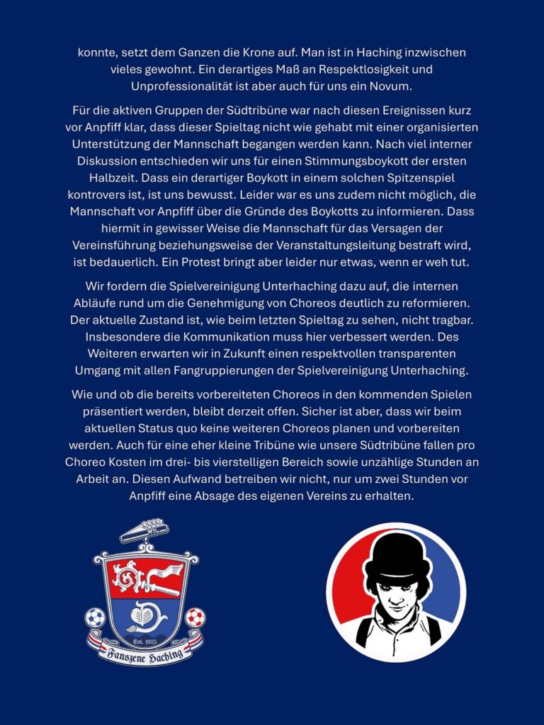In Unterhaching sorgen unterschiedliche Thematiken aktuell für Anspannungen zwischen Fans und Verein. Nachdem sich die Fanszene Haching bereits gegen den Verkauf der eigenen Spielstätte an den FC Bayern positionierte, veröffentlichte die Szene nun ein Statement, warum man beim jüngsten Heimspiel eine Halbzeit schwieg. Anders als viele dachten, lag das nicht an den angestrebten Plänen zum Sportparkverkauf.