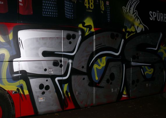 Mannschaftsbus des 1. FC Köln in Saarbrücken besprüht