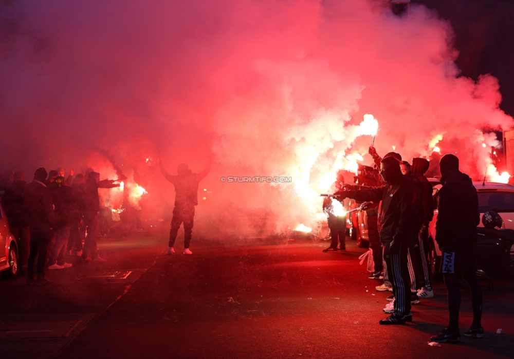 Ultras von Sturm Graz empfangen Mannschaftsbus beim Abschlusstraining vor Cupspiel