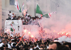 Fans und Team feiern Meisterschaft mit Bengalos