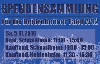 Am kommenden Samstag rufen die Heidenheimer Ultras zur Spendensammlung für die Heidenheimer Tafel auf. Daher werden an zwei Supermärkten in Schnaitheim sowie an einem Supermarkt in Heidenheim von 11 bis 15 Uhr haltbare Lebensmittel gesammelt.