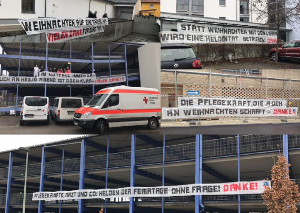 Die Heidenheimer Fangruppe bedankte sich an Heiligabend mit Spruchbändern und Plakaten vor Krankenhäusern, Rettungsdiensten und Pflegeeinrichtungen symbolisch bei den Menschen, die auch an Heiligabend und Silvester arbeiten, weil andere Menschen sie brauchen.