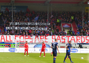 Die Anhänger von RB Leipzig zeigten beim gestrigen Montagsspiel gegen Heidenheim ein Spruchband mit der Aufschrift „Boykottieren ist ein Trend! Habt ihr ihn letztes Jahr verpennt? Mitläufer!“. Im letzten Jahr besuchten die Heidenheim-Fans das Spiel in Leipzig noch.