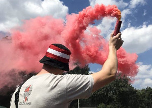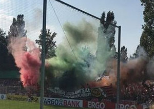 Etwa 600 Bayer 04 Leverkusen-Fans begleiteten die Werkself heute zum Auswärtsspiel in der 1. Runde des DFB-Pokals nach Pforzheim und fielen im dortigen Gästeblock durch mehrere Aktionen auf. So zündeten die Ultras von Bayer 04 eine Menge bunten Rauch.