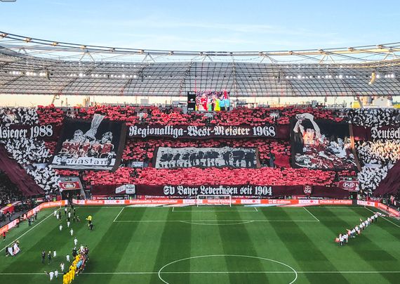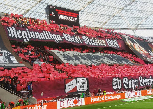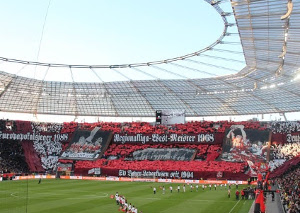 In der Nordkurve der BayArena wurde das heutige Abendspiel der 1. Bundesliga zwischen Bayer 04 Leverkusen und Borussia Dortmund mit einer großen Choreografie eingeleitet, bei der an die bisherigen Erfolge in der Vereinsgeschichte von Bayer 04 Leverkusen erinnert wurde.