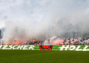 Die Diablos Leutzsch leiteten das Oberligaspiel zwischen der BSG Chemie Leipzig und der BSG Wismut Gera am Samstag mit einer Pyroshow ein, die unter dem Motto „Ein Block voll Fahnen, Pyro jederzeit - seit vielen Jahren steh`n wir für euch bereit - Chemie Ultras“ stand.