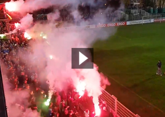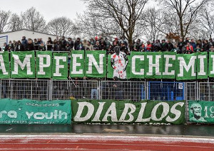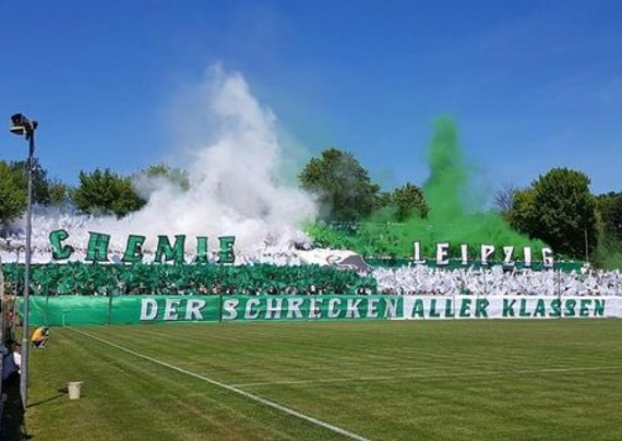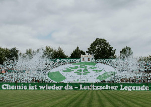 Die BSG Chemie Leipzig machte am Samstag durch einen 3:1 Heimsieg gegen Schott Jena den Aufstieg in die Regionalliga Nordost klar. Die Fans der Chemiker zeigten vor Anpfiff eine mit Pyro untermalte „Aufstieg“-Choreografie, zündeten später nochmals und stürmten nach dem Abpfiff den Platz.