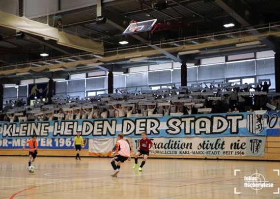 Die Fanszene des Chemnitzer FC unterstützte gestern, wie angekündigt, die U12-Jugendmannschaften ihres Vereins beim diesjährigen Klinikum-Chemnitz-Cup in der Richard-Hartmann-Halle in Chemnitz. Die CFC-Fans zeigten dabei sogar eine Choreografie.