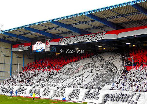Fans von Arminia Bielefeld feierten gestern beim Heimspiel gegen Hannover 96 den 90. Geburtstag der Bielefelder Al mit einer Choreografie im gesamten Stadion. „Seit 90 Jahren an den Häusern im Westen entlang, jeden zweiten Samstag im Stadion, in den Köpfen ein vertrauter Gesang“, lautete das dazugehörige Spruchband.