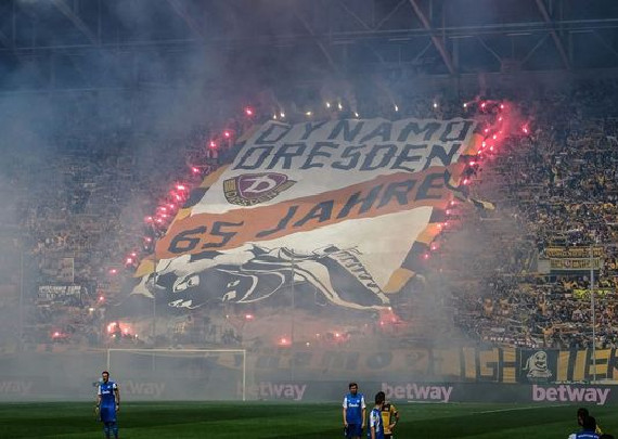 Vorm heutigen Geister-Heimspiel von Dynamo Dresden gegen den VfB Stuttgart motivierten die Ultras Dynamo die SGD-Spieler mit einer großen Pyroshow und einem Feuerwerk, das vom Spielerhotel aus zu sehen war. „Wir zusammen gegen den Rest der Welt!“, stand während der Aktion auf einem Spruchband geschrieben.