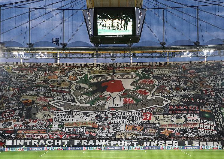 Die Ultras Frankfurt leiteten das heutige Halbfinale der Europa League zwischen Eintracht Frankfurt und dem Chelsea FC wieder mit einer Choreografie ein, die das gesamte Waldstadion, mit Ausnahme des Gästeblocks bedeckte. Eine detailliert gemalte Blockfahne überzog dabei die gesamte Nordwestkurve.