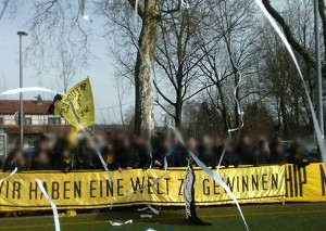 Fernab der FARE-Aktionswoche haben Anhänger des Siebtligisten RSV Göttingen 05 bei ihrem Heimspiel gegen den FC Weser am gestrigen Sonntag eine Aktion gegen Rassismus durchgeführt. Dabei gab es Pins für die Zuschauer und eine eigene Bande.