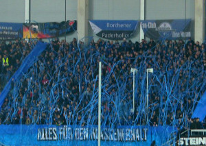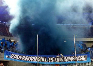 Die Fans des SC Paderborn zeigten am Montag beim Auswärtsspiel in Duisburg eine Pyroshow, die unter dem Motto „...Paderborn soll es für immer sein!“ stand. Zu dem Spruchband wurden einheitliche Fahnen geschwenkt und blauer Rauch gezündet.