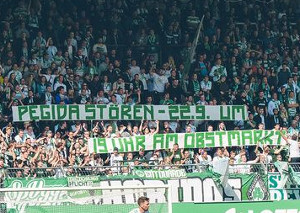 Fans der Spielvereinigung Fürth zeigten am vergangenen Sonntag beim Heimspiel gegen Fortuna Düsseldorf ein Spruchband auf der Nordtribüne im Sportpark Ronhof, mit dem für Proteste mobilisiert wird, die sich gegen einen geplanten Aufmarsch von Pegida in Fürth richtet.