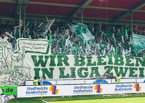 „Chaotisch und mit etwas Zauberei - Wir bleiben in Liga zwei!“, lautete das Motto der Choreografie, die die mitgereisten Fans der Spielvereinigung Fürth am Sonntag in Heidenheim zeigten. Dabei zu sehen waren die Zeichentrickfiguren Miraculix und Obelix aus dem bekannten Asterix-Comic.