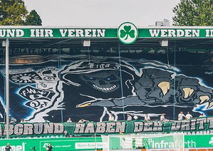 Im Sportpark Ronhof empfing die Spielvereinigung Fürth am vergangenen Sonntag Arminia Bielefeld. Auf der Nordtribüne wurde das Zweitligaspiel mit einer Choreografie eingeleitet. Zu sehen gab es eine Blockfahne, die die gesamte Fantribüne bedeckte.