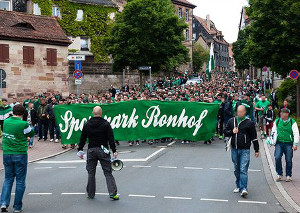 Mehrere Hundert Fans aus Fürth marschierten für eine Rückbenennung der Trolli ARENA in Sportpark Ronhof. Die SpVgg-Fans zogen vor dem letzten Ligaspiel gegen Sandhausen vom Rathaus zum Stadion. Dort wurde das Stadion symbolisch zurückbenannt.