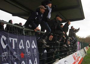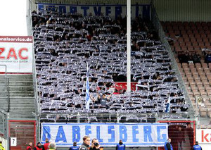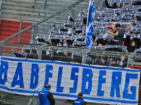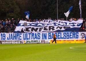 Im Karl-Liebknecht-Stadion in Potsdam kam es gestern vor 1.452 Zuschauer zum Regionalliga-Nordost Duell zwischen dem SV Babelsberg 03 und dem Berliner AK. In der Nordkurve Babelsberg auf der Gegengerade wurde das Spiel mit einer Choreografie und einer Pyroaktion eingeleitet.