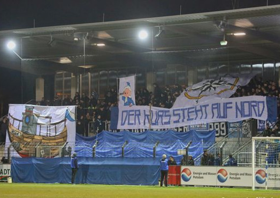 Der SV Babelsberg 03 wurde u.a. wegen „Nazischweine raus“-Rufen, mit denen Babelsberg 03 Fans auf im Gästeblock gezeigte Hitlergrüße reagierten, vom Nordostdeutschen Fußballverbandes (NOFV) bestraft. Dagegen protestierten Babelsberg 03 Fans mit einer Pyroshow.