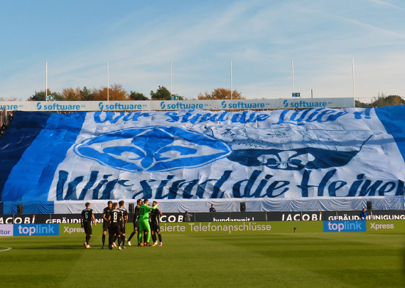 Bevor am Samstag im Stadion am Böllenfalltor das Zweitligaspiel zwischen Darmstadt 98 und dem SV Sandhausen angepfiffen wurde, war auf der Südtribüne eine zweiteilige Choreografie zu sehen. Zunächst wurde die ganze Tribüne von einer am Dach hochgezogenen Fahne bedeckt.