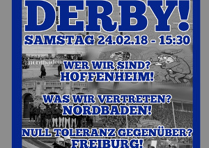 Das Hoffenheimer Fanbündnis 11hoch3, hinter dem die Gruppen B-Block Brigade, Fanatics Heidelberg, Dementio Boys, Young Boyz und Crescendo Hohenlohe stecken, macht unter dem Motto „Null Toleranz gegenüber? Freiburg!“ für das Heimspiel gegen den SC Freiburg mobil.