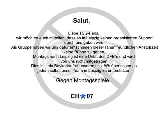 Die TSG Hoffenheim Fanclubs B-Block Brigade, Crescendo Hohenlohe, Fanatics Heidelberg, Dementio Boys und Young Boyz haben eine gemeinsame Erklärung zum DFL-Sicherheitspapier abgegeben, welches sie ablehnen. Die Fanclubs fordern die TSG Hoffenheim auf das Papier abzulehnen.