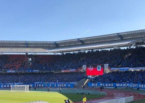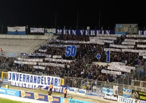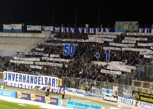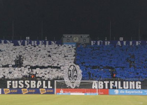 Beim gestrigen Heimspiel des TSV 1860 München gegen den TSV Buchbach war in der Westkurve des Grünwalder Stadions eine bewegte Choreografie zu sehen, die der Fußballabteilung des Turn- und Sportvereins München von 1860 e. V. gewidmet war. Die weißen und blauen Zettel wurden dabei abwechselnd in die Höhe gehalten.