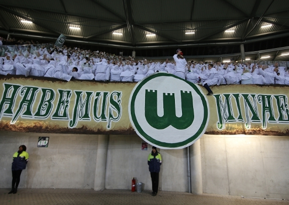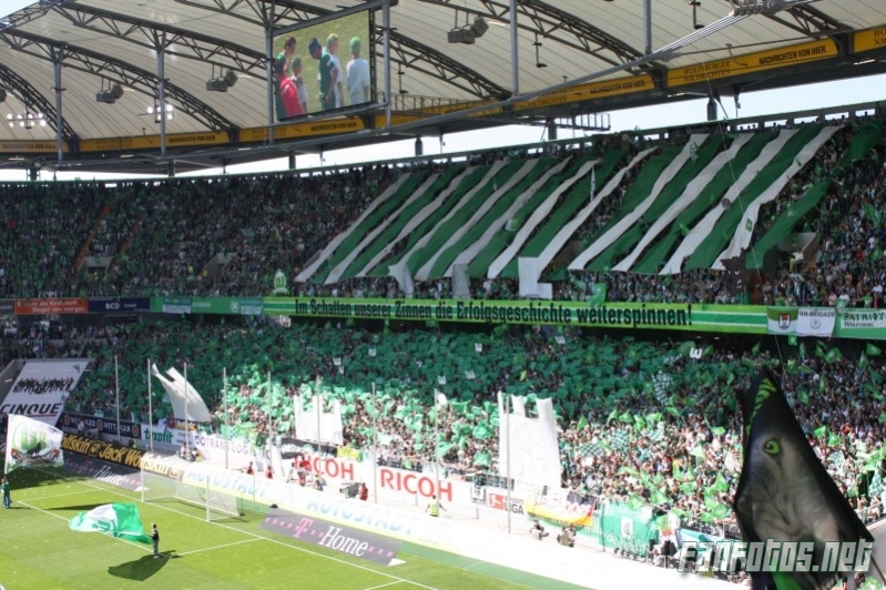 21.736 Zuschauer kamen heute zum Heimspiel des VfL Wolfsburg gegen Bayer 04 Leverkusen. In der Nordkurve Wolfsburg wurde das Bundesliga-Spiel mit einer Choreografie eingeleitet, bei der erneut das alte VfL Wolfsburg-Vereinswappen mit den Zinnen auf einer Blockfahne zu sehen war.
